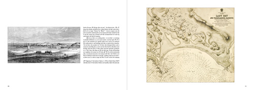 The book is a collection of the best images (mostly in B&W) from 15 years of Great Ocean Road Calendars. The first image is of Queenscliff and thereafter they follow the coastline through to the Discovery Bay Coastal Park, beyond Portland. Accompanying the images is text from two historic journals. The first is the 1879-80 diary of Ernest (Chinese) Morrison’s walk along the Great Ocean Road and the second is Eleanor Parkinson’s account of a three week excursion to Cape Otway with the Roadknight family in 1863. Scattered throughout are old engravings of townships and British Admiralty charts of the coastline, all from the same period as the journals.